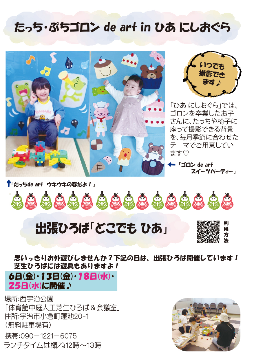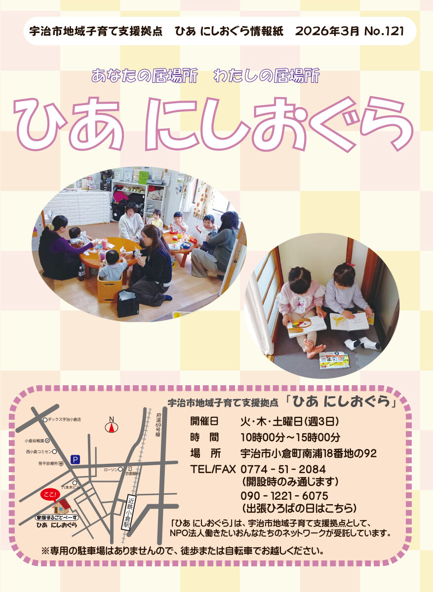 ~あなたの居場所 わたしの居場所 ~「ひあ にしおぐら」は、宇治市地域子育て支援拠点事業として、NPO法人働きたいおんなたちのネットワークが受託しています。